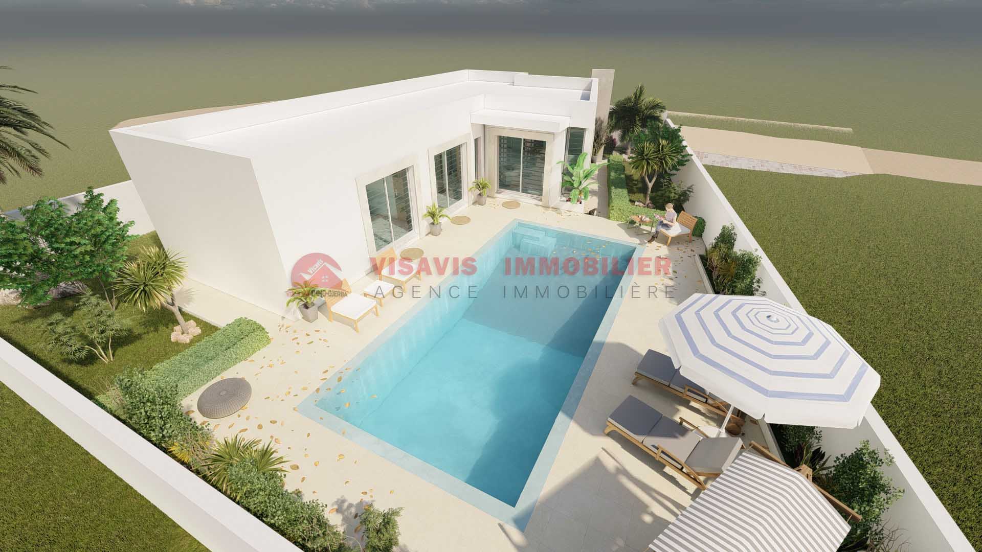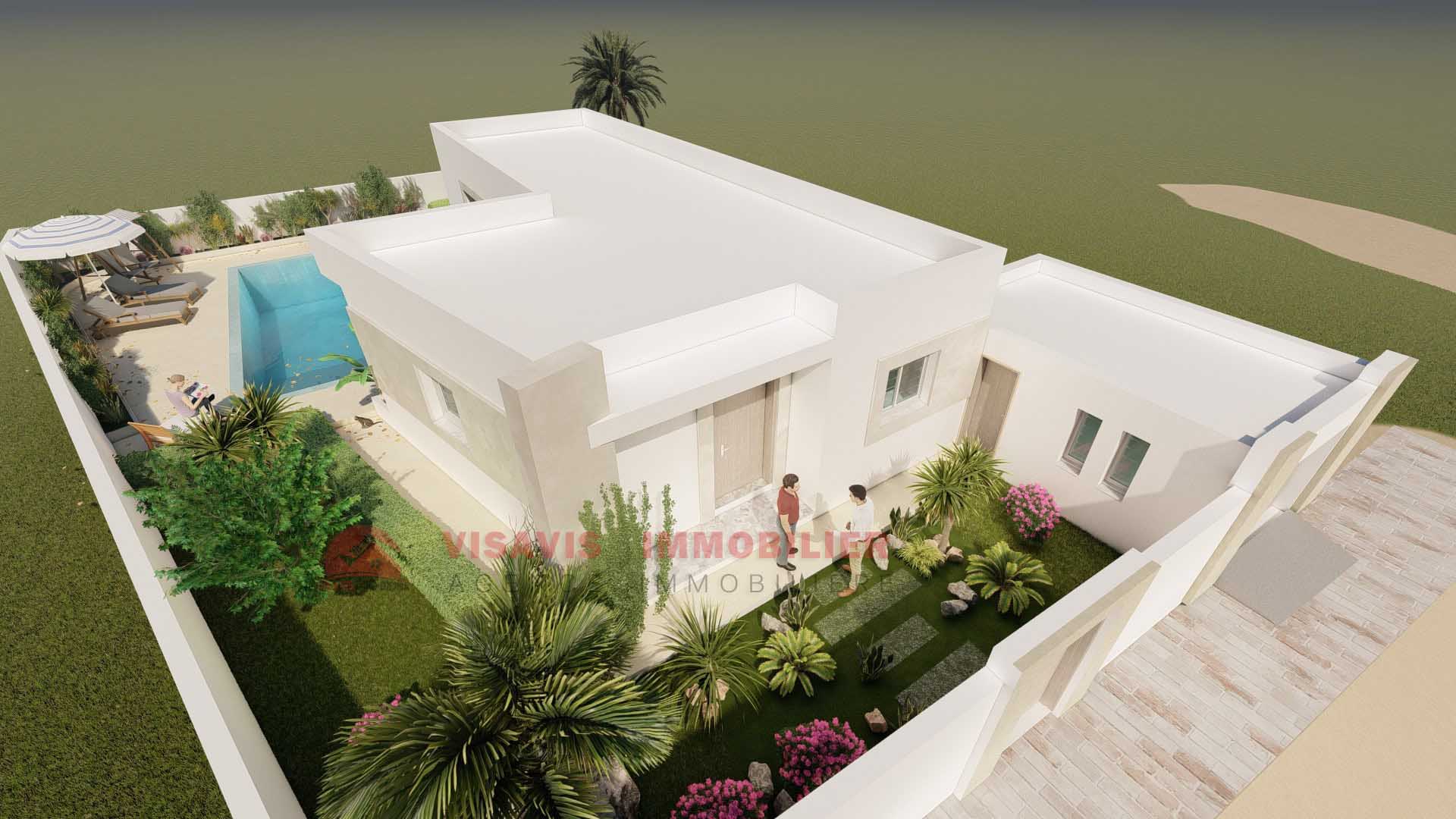 Votre futur maison à Djerba de style moderne 108m²: Salon - salle à manger - cuisine aménagée avec éléments bas & hauts, 1 salle d'eau avec lave main, 1 chambre avec placard & 1 suite parentale avec dressing et salle d'eau. Sur un terrain de 446m² situé à 5 minutes du centre ville de Houmt Souk.