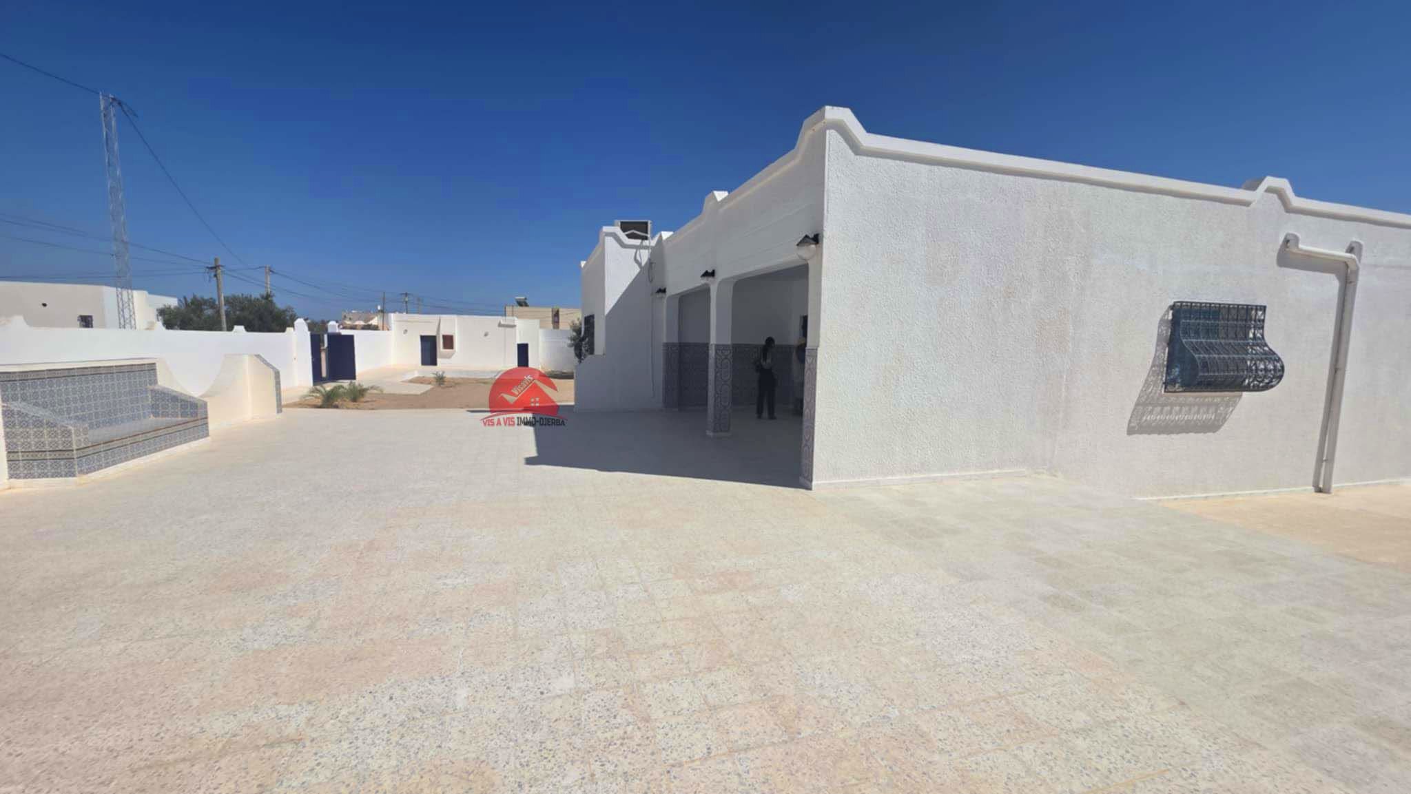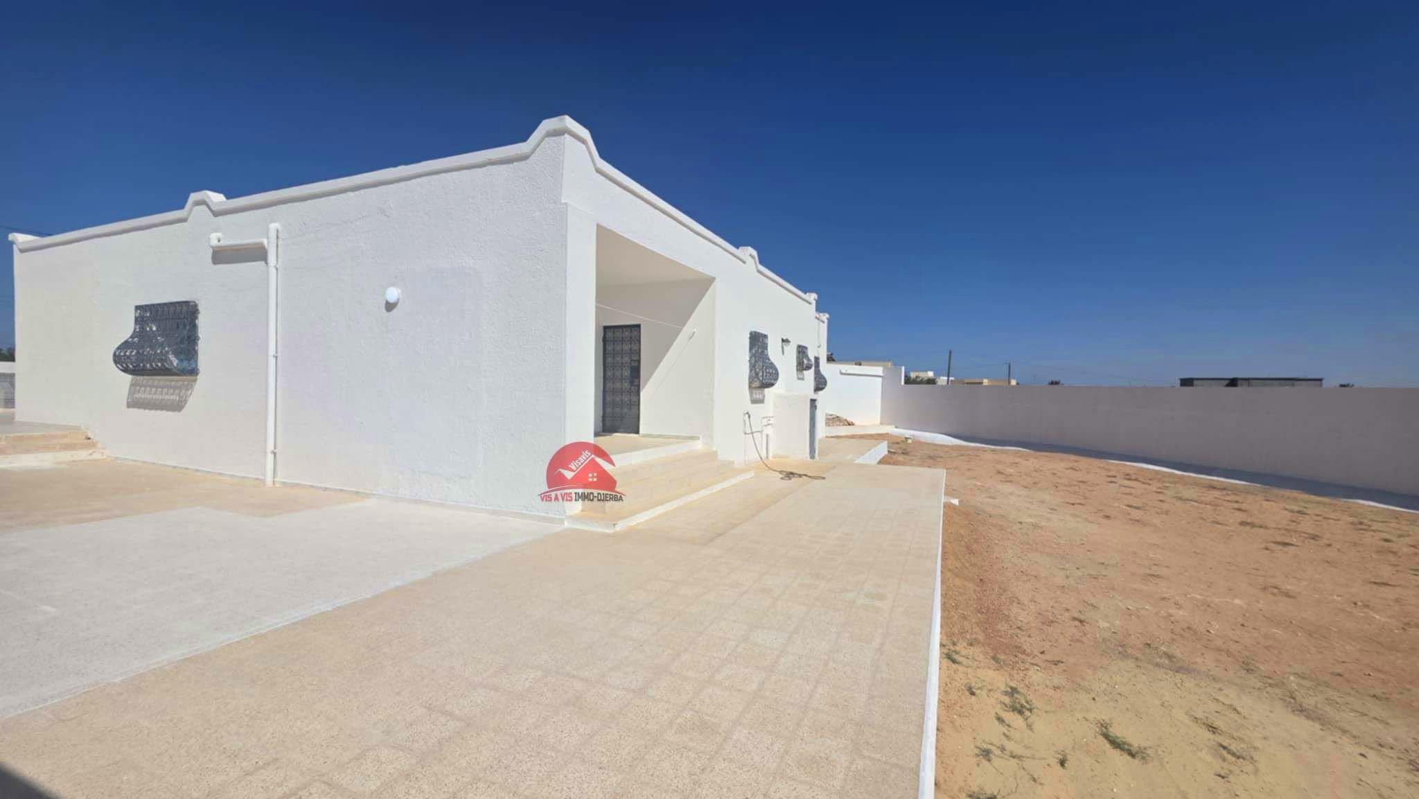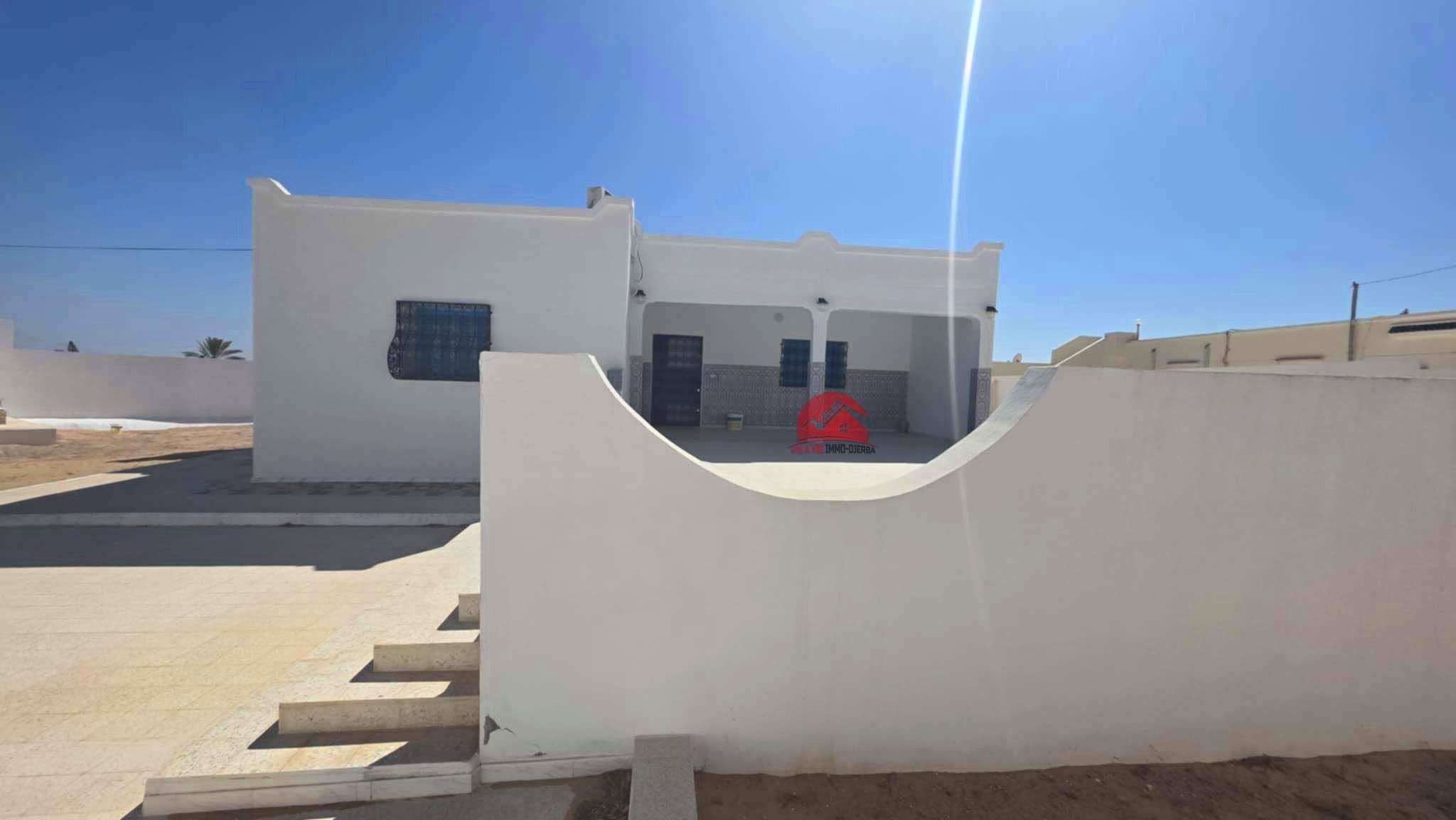 A vendre une maison récente de plain pieds qui couvre 201 m², implantée sur un terrain avec titre bleu individuel de 1782 m² à Houmt Souk Riadh Djerba.